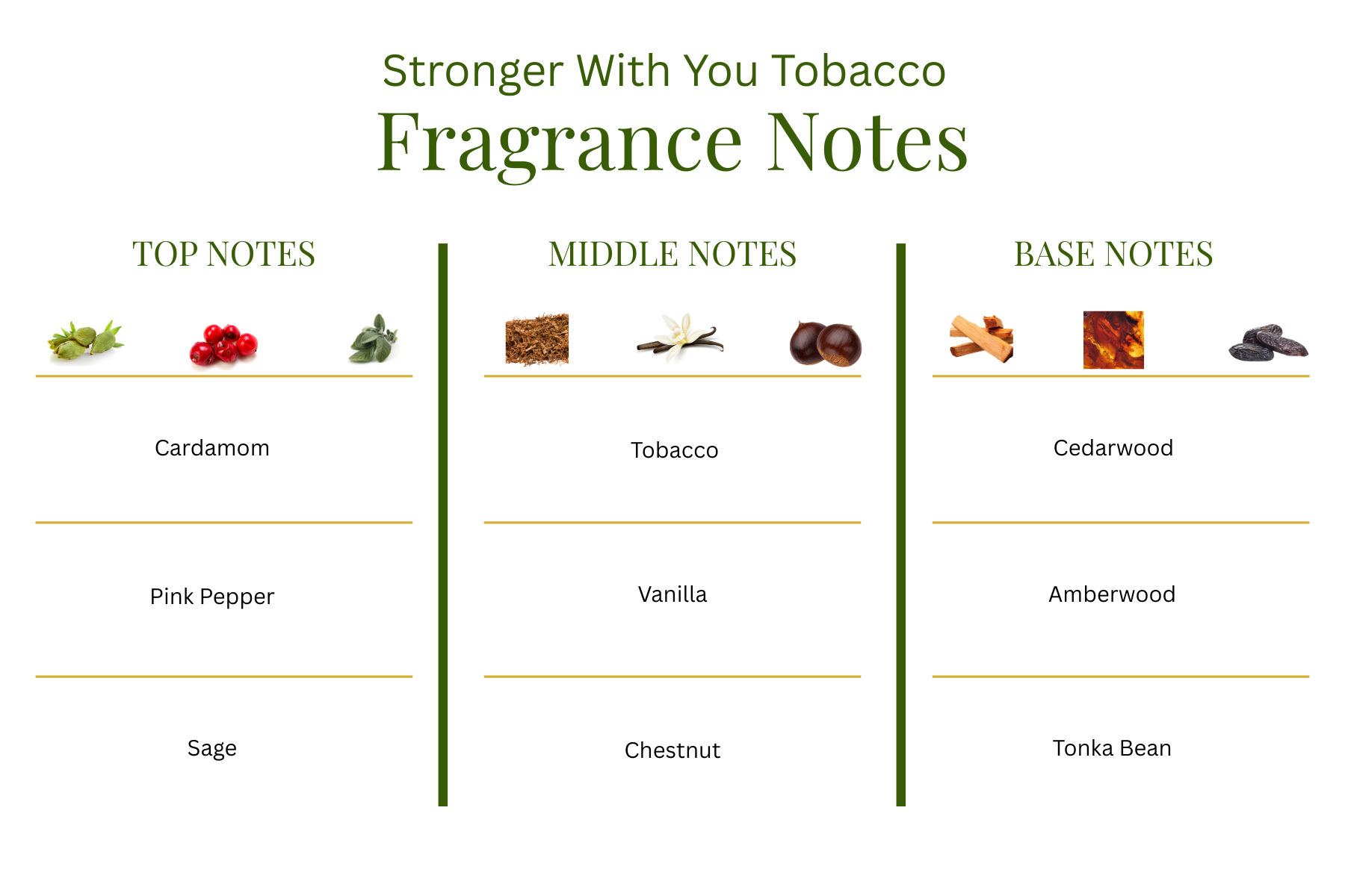INSPIRED BY STRONGER WITH YOU TOBACCO: A warm, addictive fragrance that fuses sweet spices with rich tobacco and sensual woods. Stronger With You Tobacco is intense, comforting, and irresistibly masculine.
