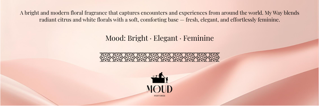 INSPIRED BY MY WAY: A bright and modern floral fragrance that captures encounters and experiences from around the world. My Way blends radiant citrus and white florals with a soft, comforting base — fresh, elegant, and effortlessly feminine.